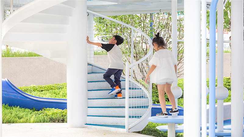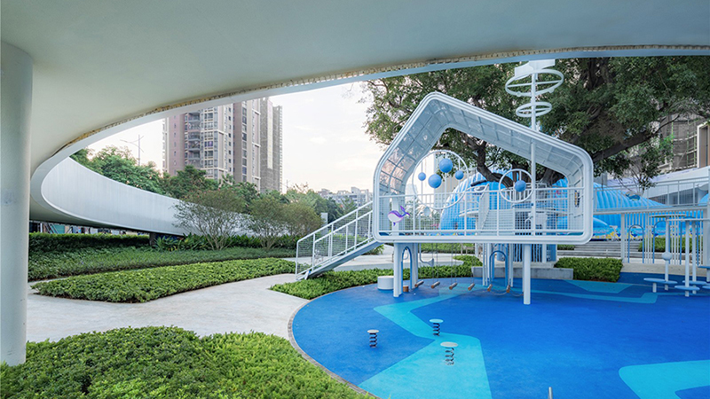 社区休闲空间游乐场所的设计围绕着老树,建造了一座悬浮在空中的景观廊桥,廊桥与原建筑室外平台相连,形成上下贯通的步道,多方位的空间流线增强了自由性和开放性,同时也让空间更加新颖有趣。